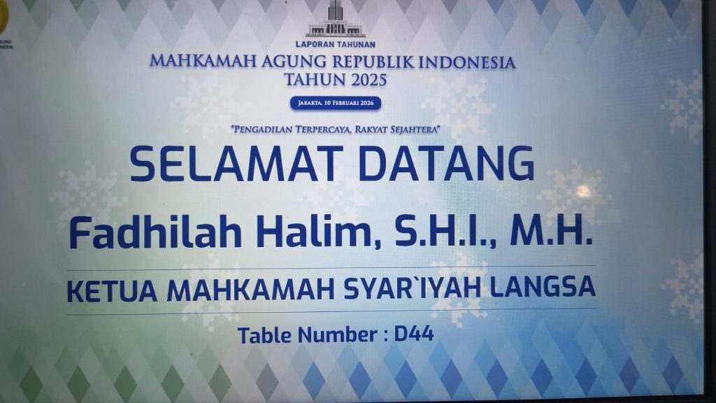 Ketua Mahkamah Syar’iyah Langsa, Ibu Fadhilah Halim, S.H.I., M.H., menghadiri rangkaian kegiatan Sidang Istimewa Laporan Tahunan Mahkamah Agung Republik Indonesia Tahun 2025. Acara bergengsi yang mempertemukan para pimpinan pengadilan dari seluruh Indonesia ini berlangsung selama dua hari, terhitung sejak tanggal 9 hingga 10 Februari 2026, berpusat di Gedung Mahkamah Agung RI, Jakarta.