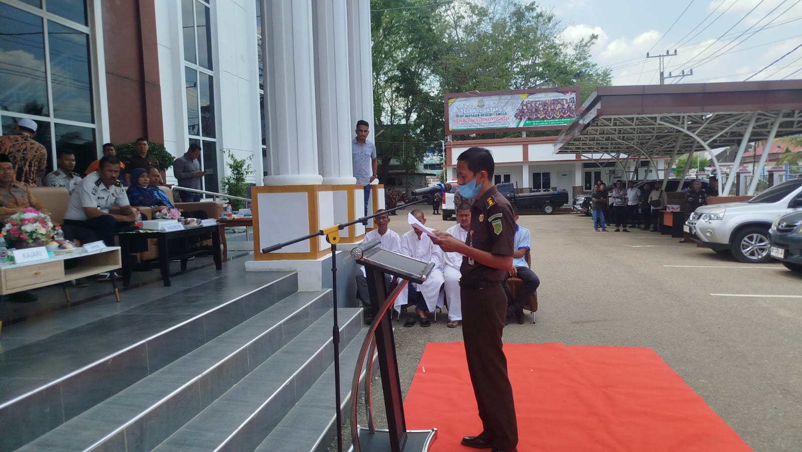 Hadir dalam pelaksanaan eksekusi tersebut Hakim Pengawas Mahkamah Syar’iyah Langsa Bapak Yasin Yusuf Abdillah, S.H.I., M.H., dan Sekretaris Mahkamah Syar’iyah Langsa Bapak Irwan, S.T., Kegiatan cambuk tersebut dilaksanakan oleh Kejaksaan Negeri Kota Langsa dan Tim Terpadu Eksekusi Uqubat Kota Langsa. Dihadiri para pejabat terkait antara lain Kejaksaan Negeri Langsa, Dandim 0104/Atim, Pengadilan Negeri Langsa, Satuan Polisi PP dan WH (Pamong Praja dan Wilayatul Hisbah), Dinas Syariat Islam, serta dokter pendamping. Keluarga para terpidana juga tampak hadir menyaksikan proses tersebut.