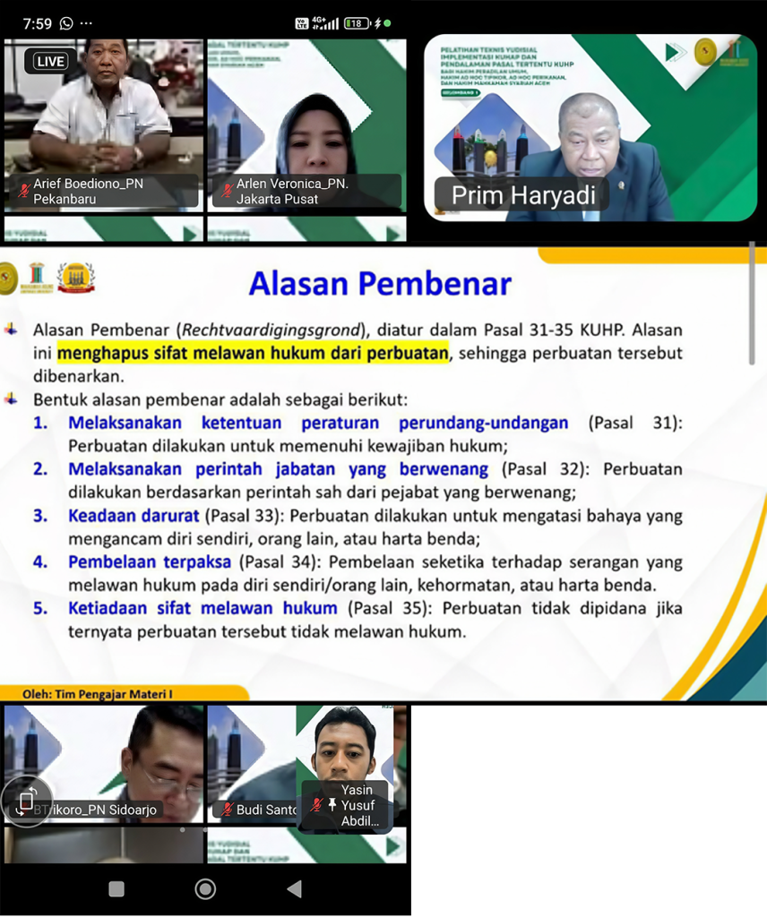 Keikutsertaan dalam kegiatan ini merupakan bentuk komitmen guna mendalami implementasi Kitab Undang-Undang Hukum Acara Pidana (KUHAP) serta memahami lebih dalam pasal-pasal tertentu dalam Kitab Undang-Undang Hukum Pidana (KUHP) yang baru. Hal ini sejalan dengan kewajiban bagi setiap hakim untuk senantiasa menjaga profesionalisme dan meningkatkan pengetahuan guna mendukung kinerja peradilan yang berkualitas
